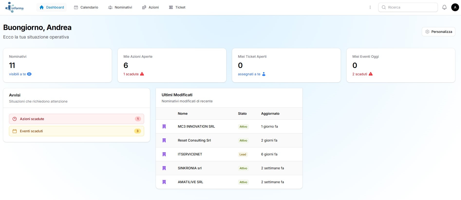Informa CRM è una soluzione web completa dove basta digitare l’azienda che cerchi e il sistema ti «Informa» di tutto quello che c’è da sapere su quel nominativo… importanza, numeri di telefono di tutti i contatti, sedi operative, attività in corso ed inoltre documenti inviati o ricevuti, ordini da evadere, storico richieste, fatture fatte, pagamenti effettuati…. Un archivio centralizzato di tutte le informazioni e i dati per il business aziendale.
